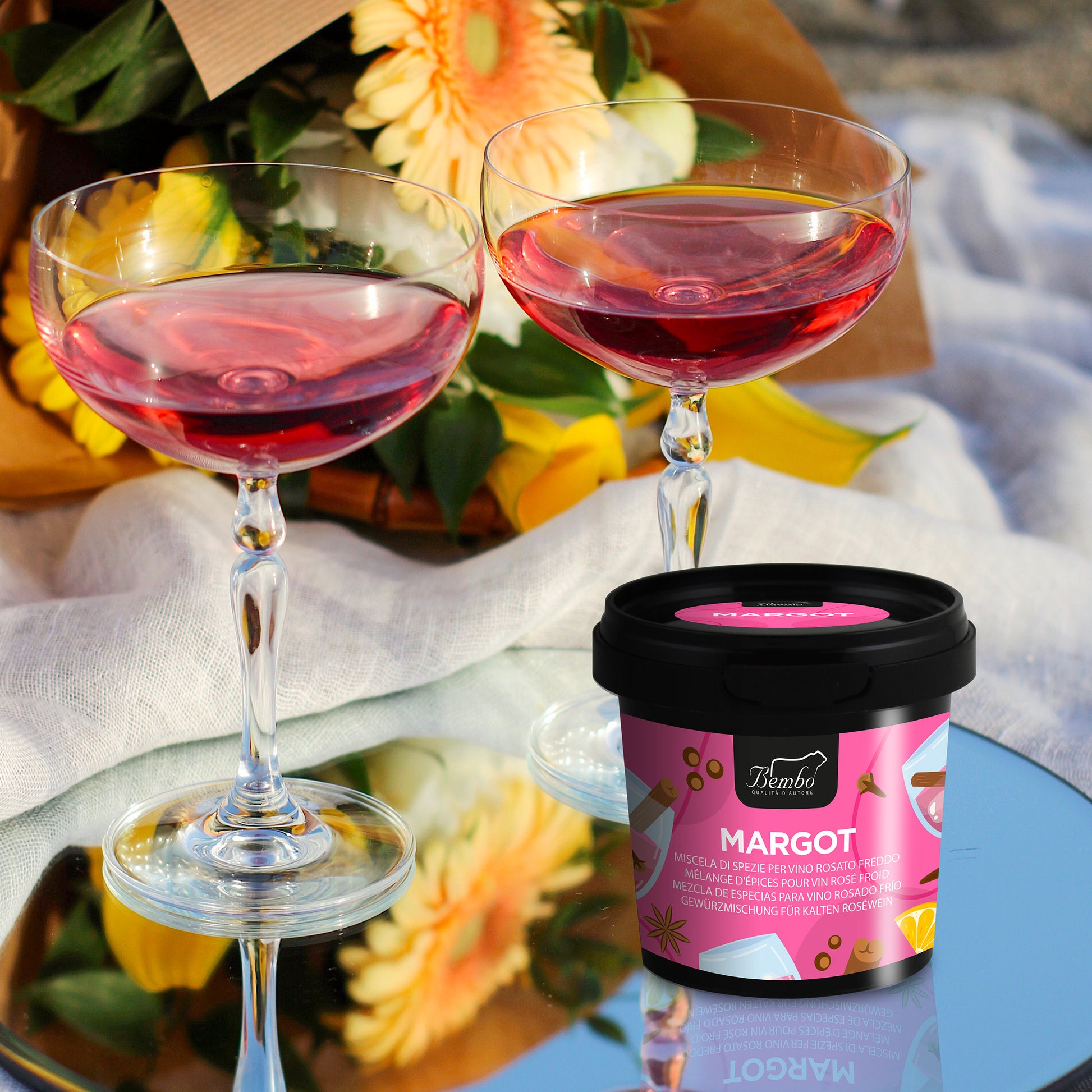 - Margot : A light, sparkling wine with cane sugar and spices for a fresh, lively drink. Pour 1 liter of rosé wine into a carafe and add the entire contents of the jar. Let it rest in the refrigerator for 4-5 hours, stirring occasionally. Strain through a sieve and serve.