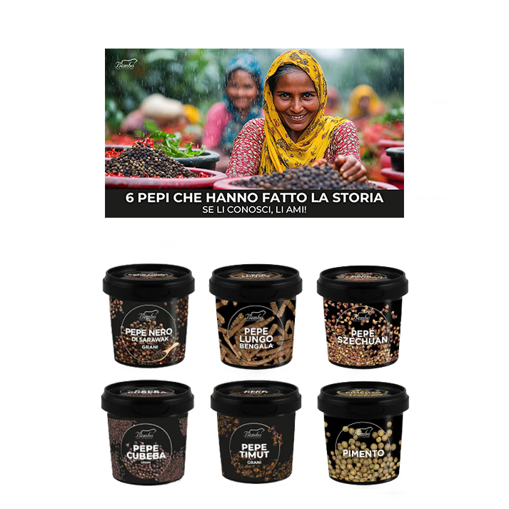 Bembo vous invite à un voyage sensoriel dans le monde des épices avec notre sélection exclusive de six variétés de poivre, chacune avec ses caractéristiques uniques et ses histoires fascinantes. Ce paquet de poivrons vous invite à explorer différents arômes, saveurs et traditions, offrant une expérience culinaire sans précédent. Parfait pour les amateurs de cuisine et pour ceux qui souhaitent enrichir leurs recettes de touches exotiques et sophistiquées.