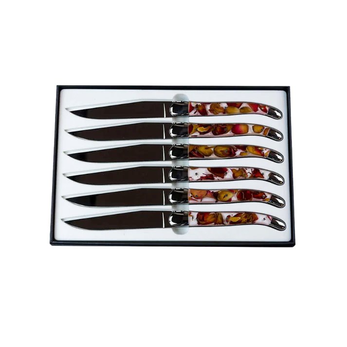 Les paillettes dorées du manche rappellent les bulles de Champagne, pétillantes et lumineuses, synonymes de fête et de plaisir. Ces merveilleux couteaux ont aussi l'esprit pétillant du Champagne, indispensables sur chaque table, ils épatent les convives par leur élégance et leur manche particulier.