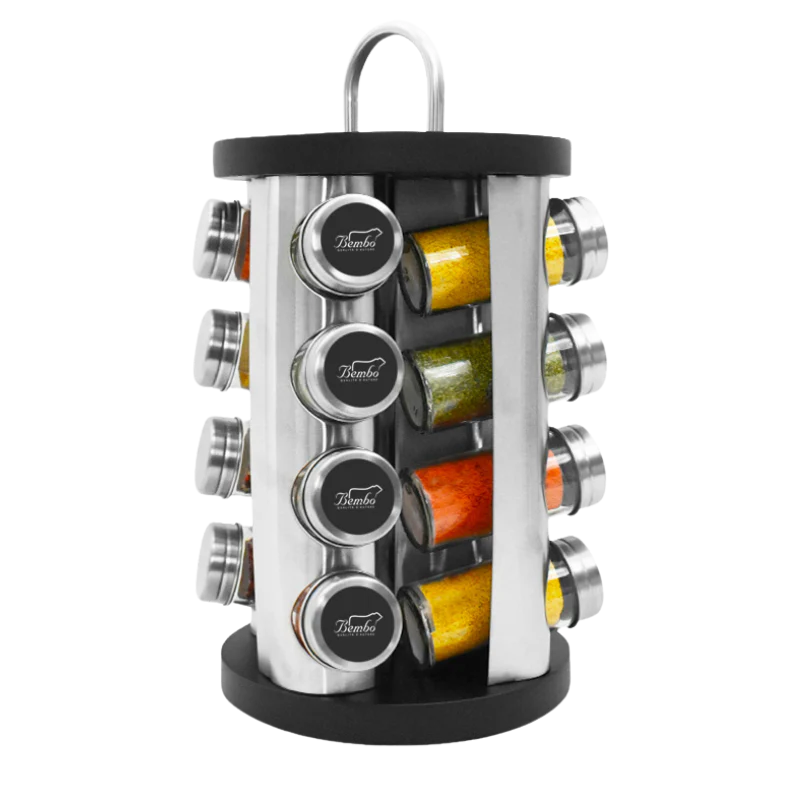 Portaspezie in acciaio e legno nero con 16 contenitori vuoti.