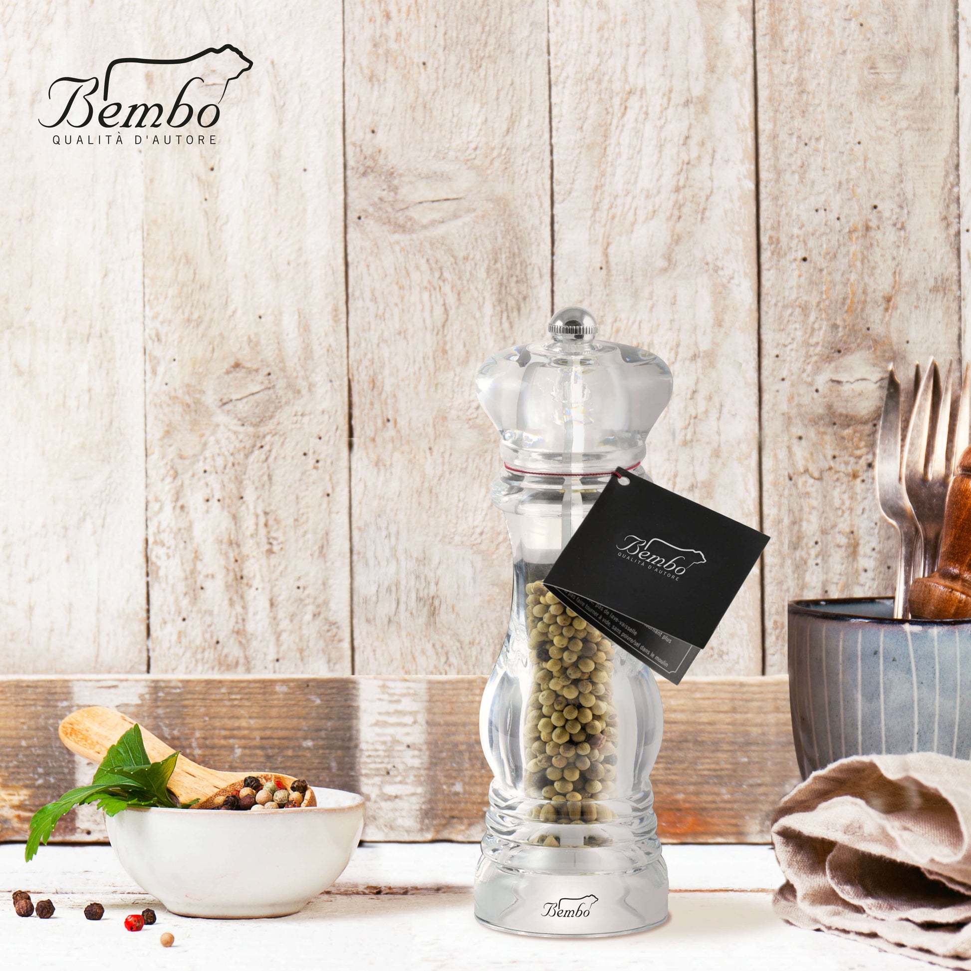 - CARATTERISTICHE E STRUTTURA: la Macina Pepe è alta 21 cm e ha una struttura in Polimero Termoindurito (comunemente utilizzato per uso odontoiatrico) trasparente. Formata da 2 pezzi: il corpo e la testa, uniti da un dispositivo di collegamento diretto alla macina in ceramica regolabile. La Macina Pepe Bembo è molto resistente: Antigraffio, antiossidante, trasparente, elegante, non richiede particolari manutenzioni.