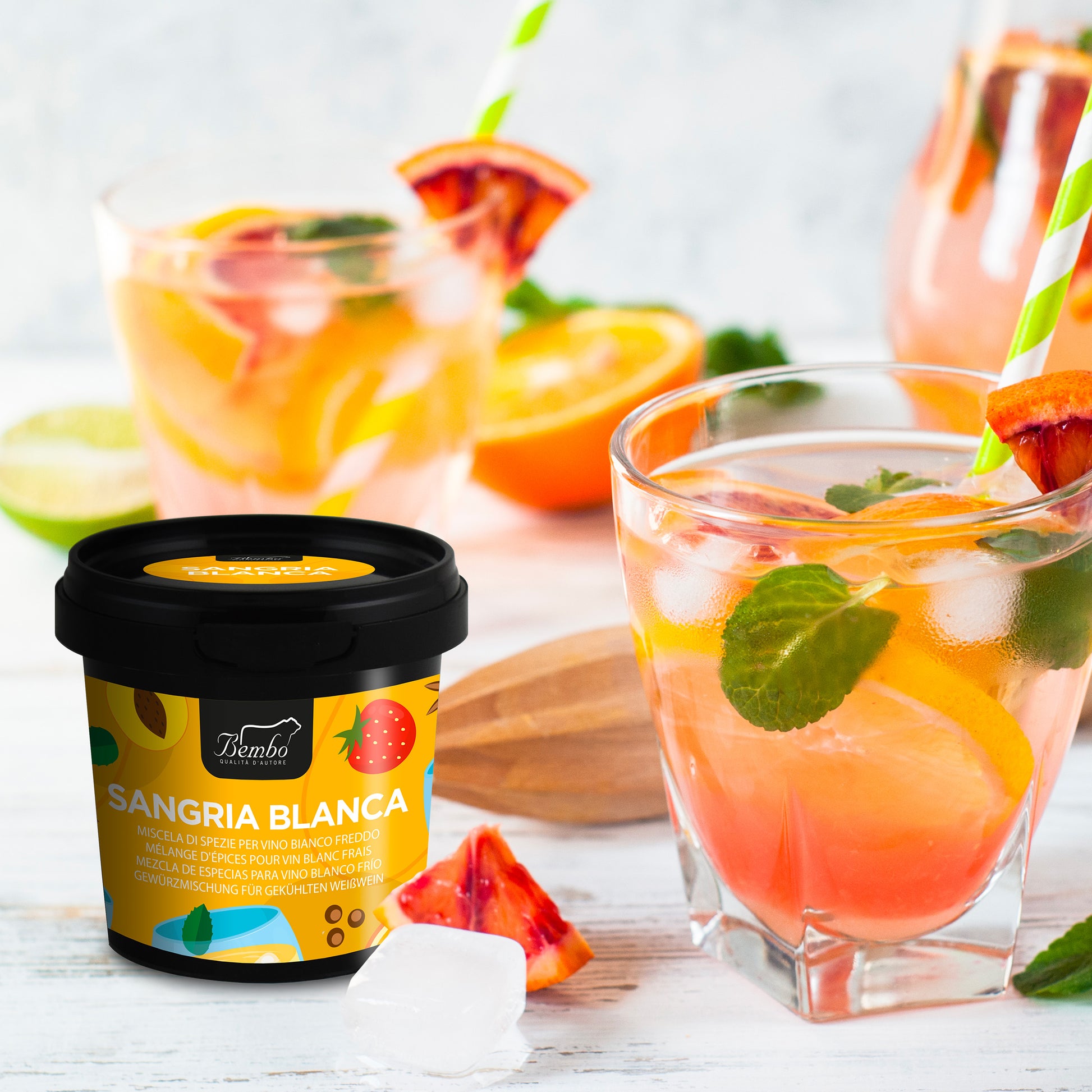 - 3 Sangria Blanca: una rinfrescante bevanda a base di vino bianco, fruttata e perfetta per le calde giornate estive. Versare in una caraffa 750 cl. di vino bianco e aggiungere tutto il contenuto del vasetto. Arricchire con ghiaccio e frutta fresca (mele e pesche a cubetti, acini d’uva, fettine di arancia). Lasciare riposare per 4/5 ore mescolando di tanto in tanto.